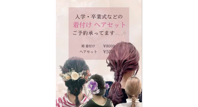 【卒業式・入学式の着付けヘアセットのご予約】 SHOP NEWSBy develop2023年2月3日日頃よりLicoをご利用頂き誠にありがとうございます。 2023年年度末にかけて今年卒業・入学をされるお客様に、Licoでヘアセット・着付けのご予約を承っております。 ヘアセット ¥5000 着付け袴(はかま) ¥800…